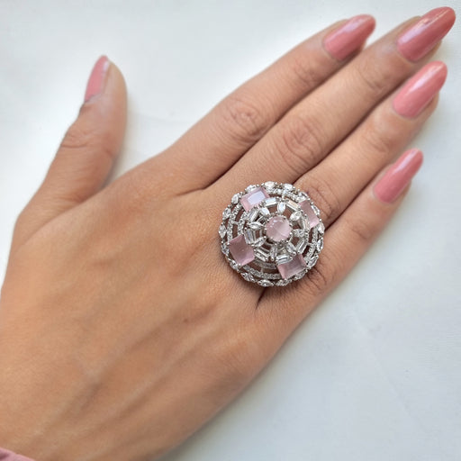 View full detailsSilver Plated Brass Ring with Rose Quartz and Ad Stones: Elegant Radiance