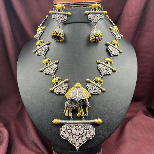 Diwam JewelsIntroducing the Rose Quartz Elephant Design Metal Jewelry Set: a stunning necklace and earrings ensemble featuring intricate...